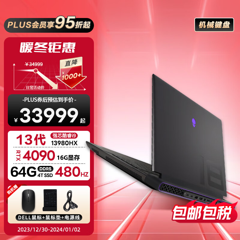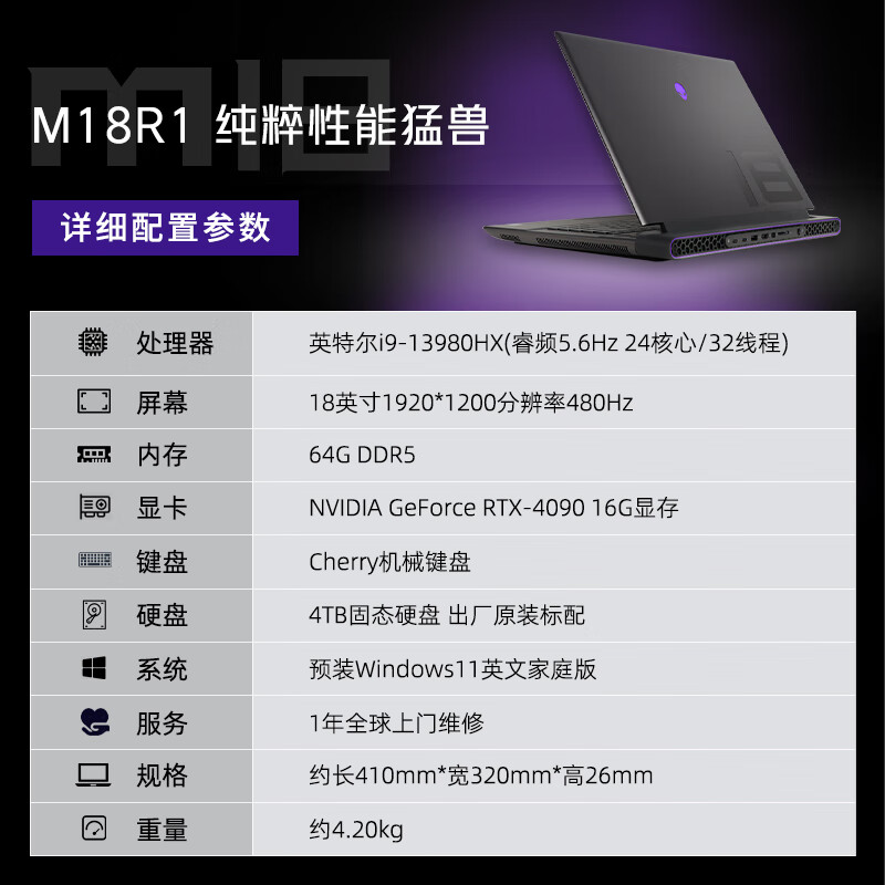 外星人(Alienware)全新M18 R1 高端电竞游戏本笔记本电脑 13代i9-13980HX RTX4090 64G 4T 1920x1200-480HZ 机械键盘价格:34999.00元!