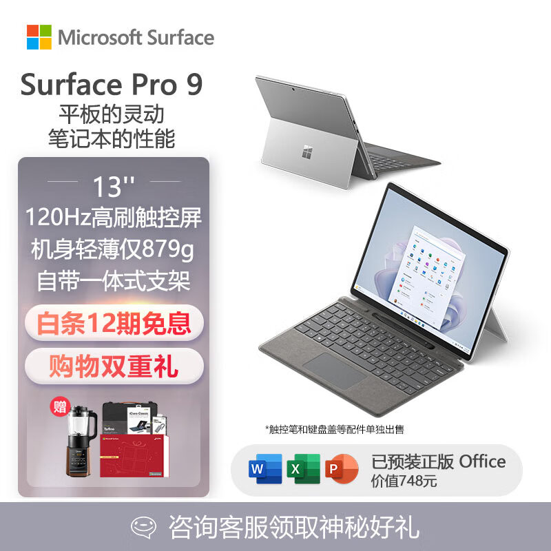 微软Surface Pro 9 二合一平板电脑 i7/16G/512G亮铂金 13英寸高刷触控 教育学习机 高端办公 笔记本电脑价格:14788.00元!