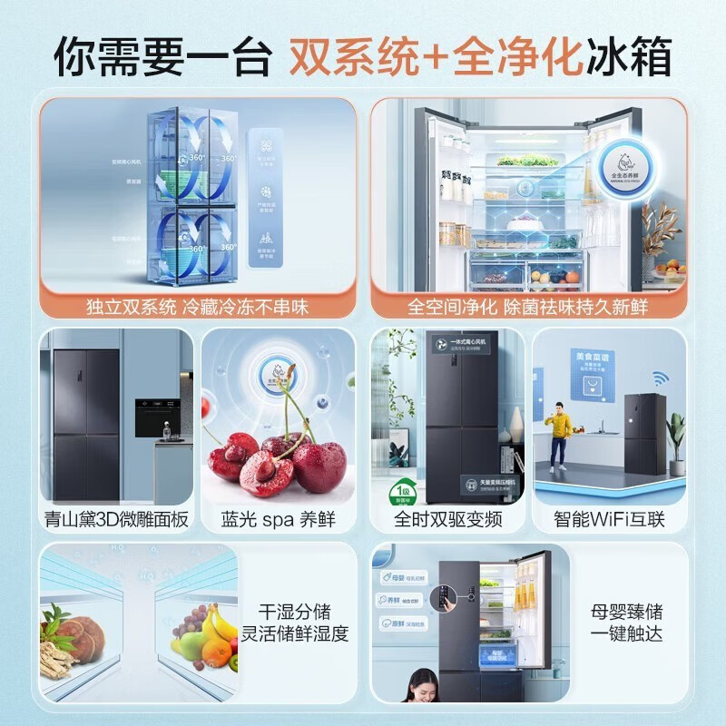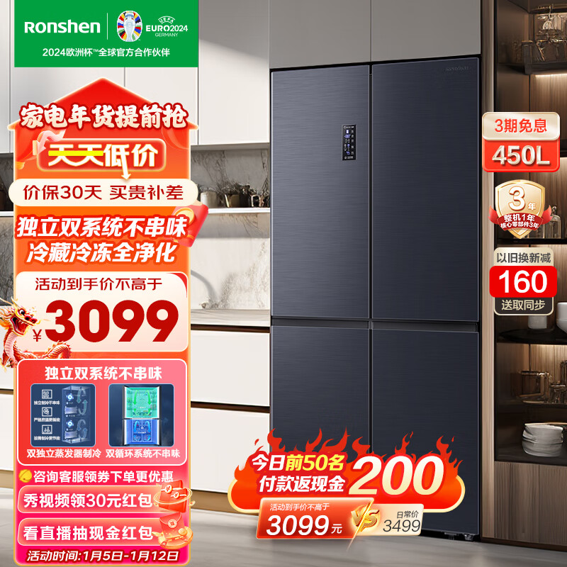 容声450升冰箱四开门十字对开门双开门多门嵌入式超薄双循环系统一级变频风冷无霜家用电冰箱 BCD-450WD16FPA价格:3499.00元!