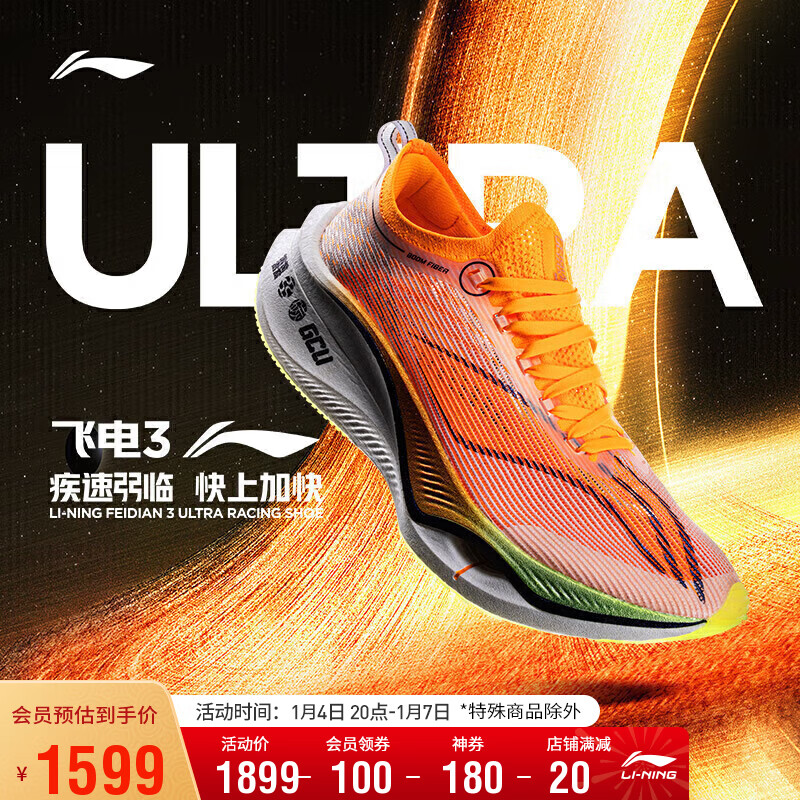 李宁飞电3.0 ULTRA丨跑步鞋情侣鞋支撑稳定回弹竞速跑鞋ARMT033价格:1899.00元!