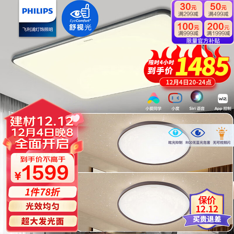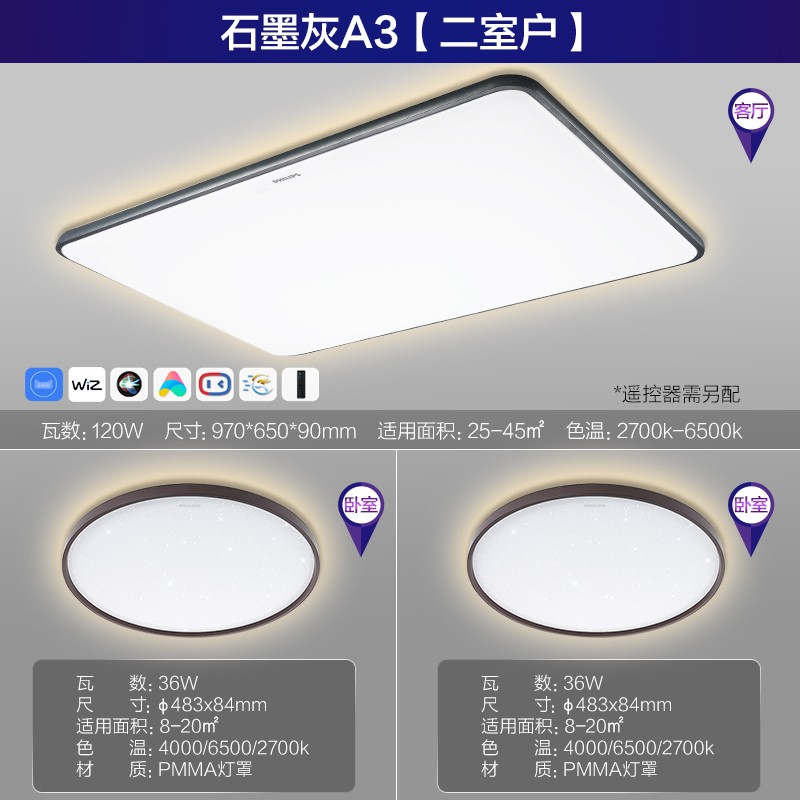 飞利浦led吸顶灯超薄客厅灯餐厅卧室灯智控调光灯具套餐两室一厅 怡轩灰价格:2289.00元!