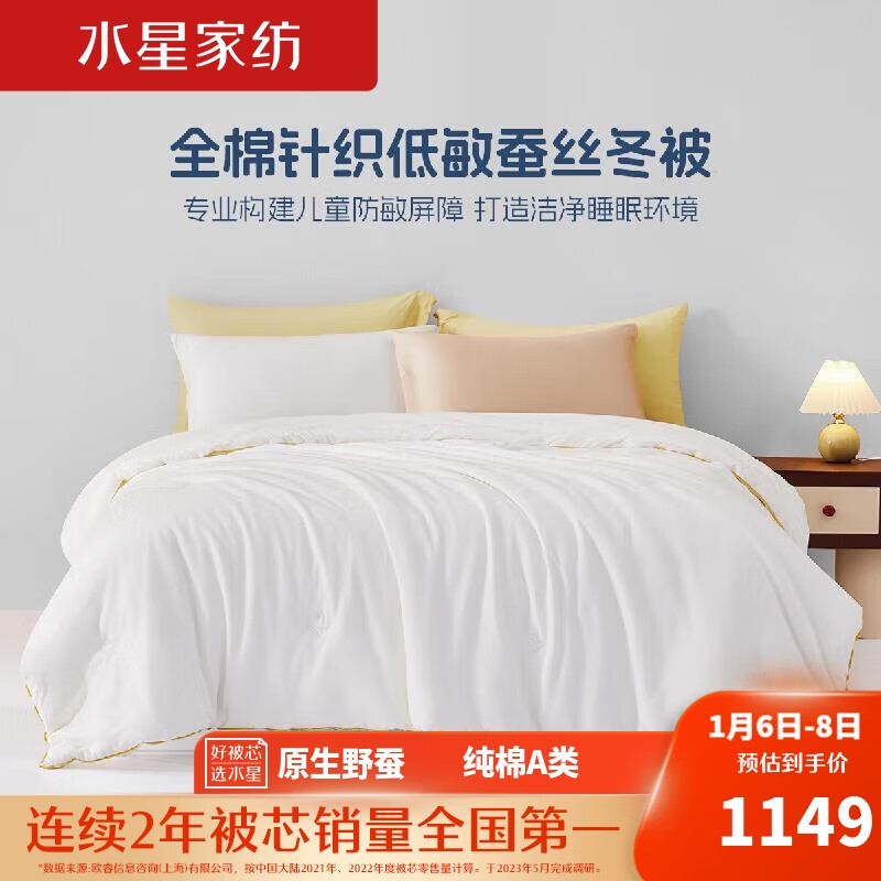 水星儿童低敏被A类纯棉100%蚕丝秋冬双人厚被子 约7.9斤220*240cm白价格:2049.00元!