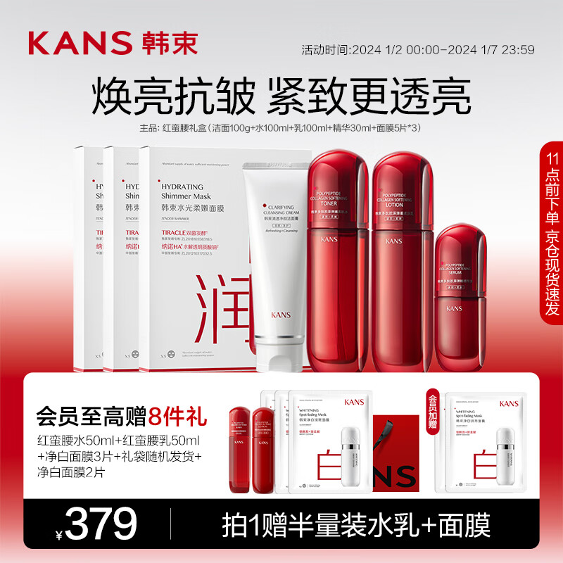 韩束红蛮腰洁水乳精华面膜7件套 抗氧抗糖紧致化妆品护肤品套装价格:379.00元!