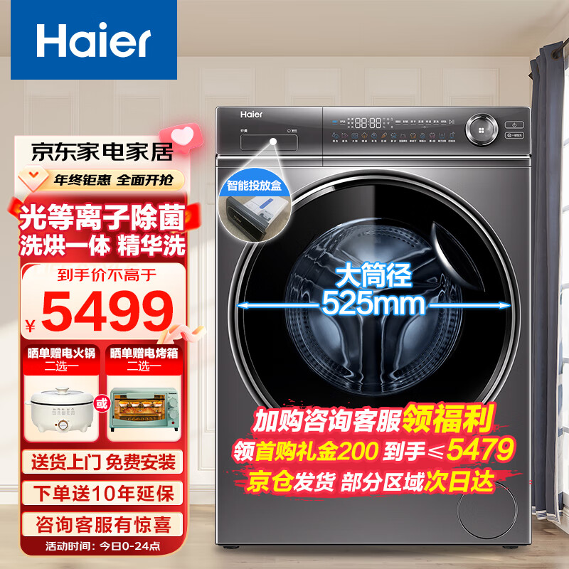 海尔(Haier)【精华洗】10KG滚筒洗衣机全自动家用大容量直驱变频一级智能投放洗烘一体G100388HBD14LSU1[家电]价格:5699.00元!