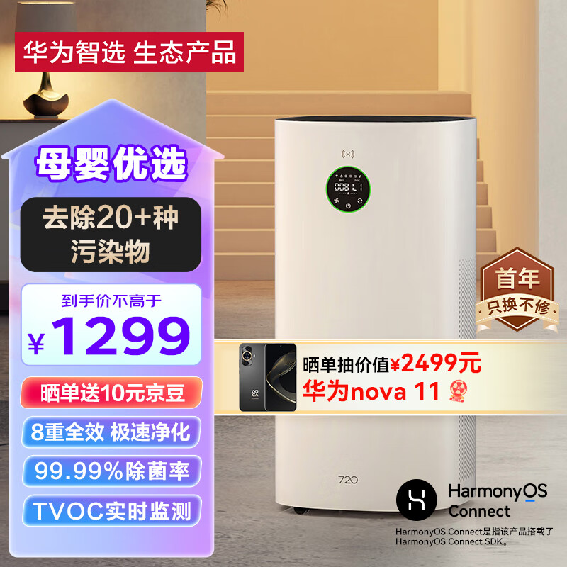 华为智选720空气净化器3s 8重疾速净化 专业除甲醛除异味除空气污染物 家用升级 雅致白价格:1299.00元!
