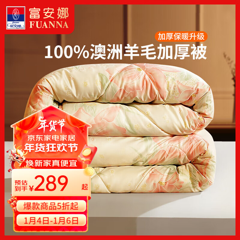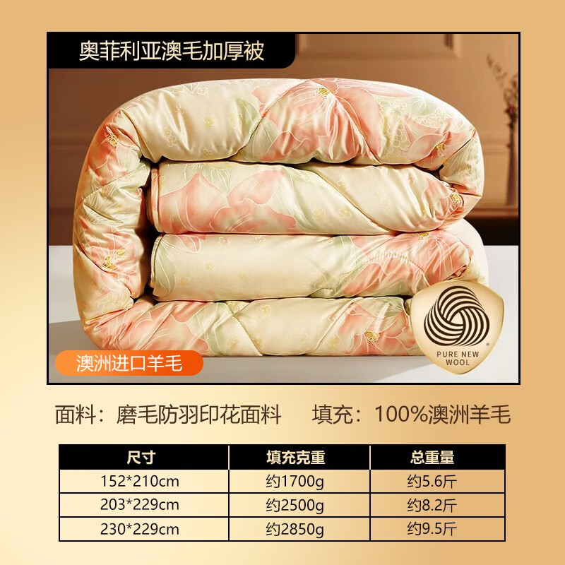 富安娜家纺 100%澳大利亚进口纯羊毛冬被 加厚被重约5-9斤 磨毛防钻绒印花款-全羊毛加厚被 1.8米床(被芯:230*229cm)价格:338.00元!
