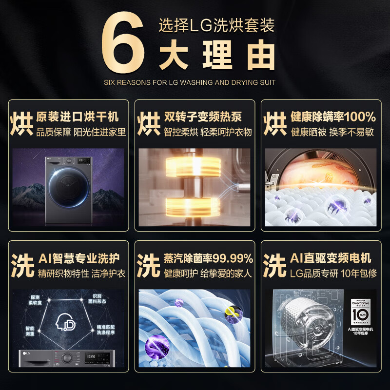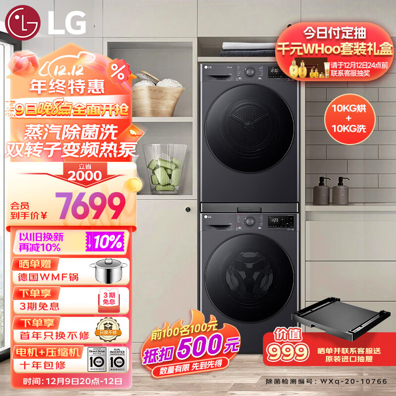 LG星云黑洗烘套装 10kg蒸汽除菌洗衣机+10kg进口双转子变频热泵烘干机家用 FCY10Y4M+RH10V3MVTW价格:9199.00元!