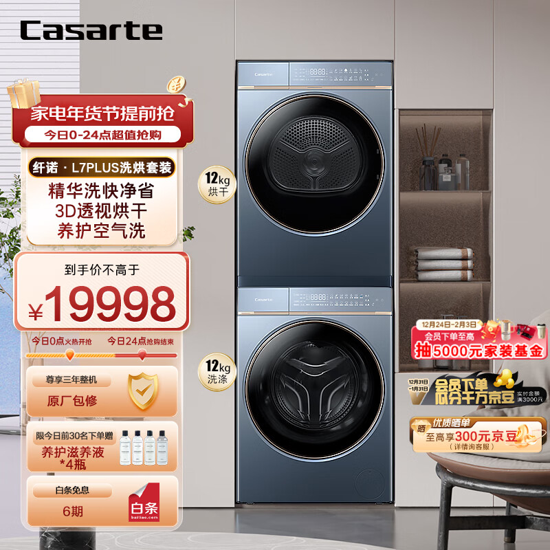 卡萨帝(Casarte)纤诺L7洗烘套装 精华洗滚筒全自动+双擎热泵烘干机 呼吸窗 3D透视烘干CGY 12FL7EU1+C1 DN12L7ELU1价格:19998.00元!