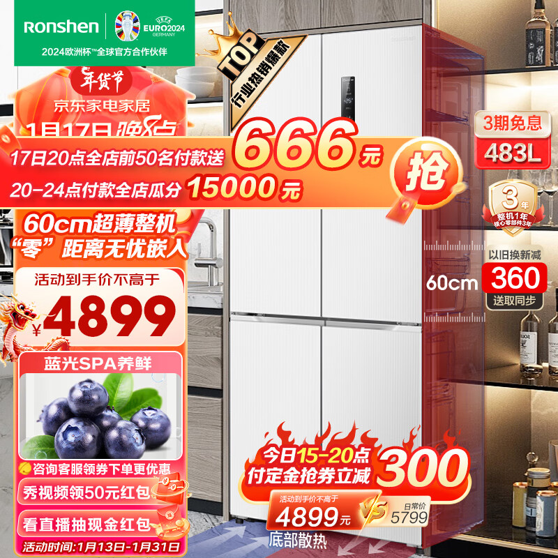容声(Ronshen)60cm平嵌系列483升十字四开门一级变频超薄“零”嵌入底部散热大容量可嵌入冰箱 BCD-483WD3FPQ价格:5199.00元!
