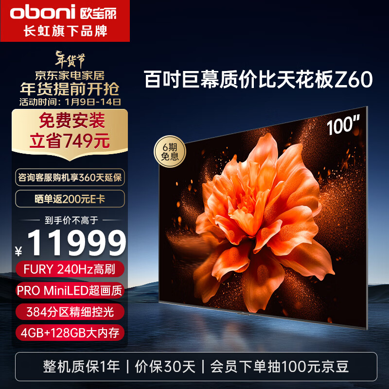 长虹电视欧宝丽100Z60 100英寸384物理分区PRO MiniLED1000nit峰值亮度4+128GB巨幕影院平板液晶电视机价格:11999.00元!