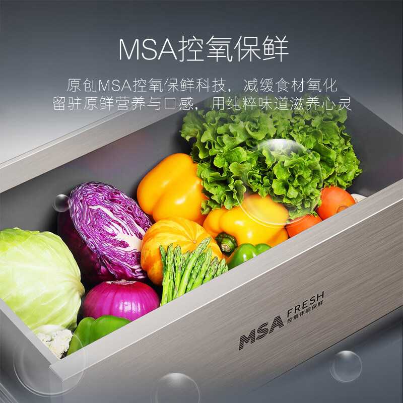 2、外形外观:简约大方,高级感满满,摸上去很有质感,凉凉的,表面有保护膜容量大小:容量很大,全家够用,尤其是分区保鲜功能很好