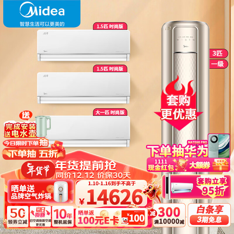 美的(Midea)风尊空调套装三室一厅一套购齐 新一级能效 变频挂机柜机 立式空调 以旧换新 3匹柜机+风尊时尚版价格:14626.00元!