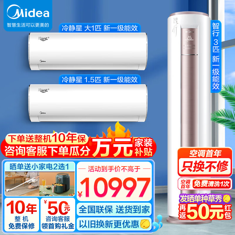 美的(Midea)新一级能效 空调套装 二室一厅套餐 变频冷暖 智能家用空调 3匹智行+1.5匹冷静星+1匹冷静星价格:10997.00元!