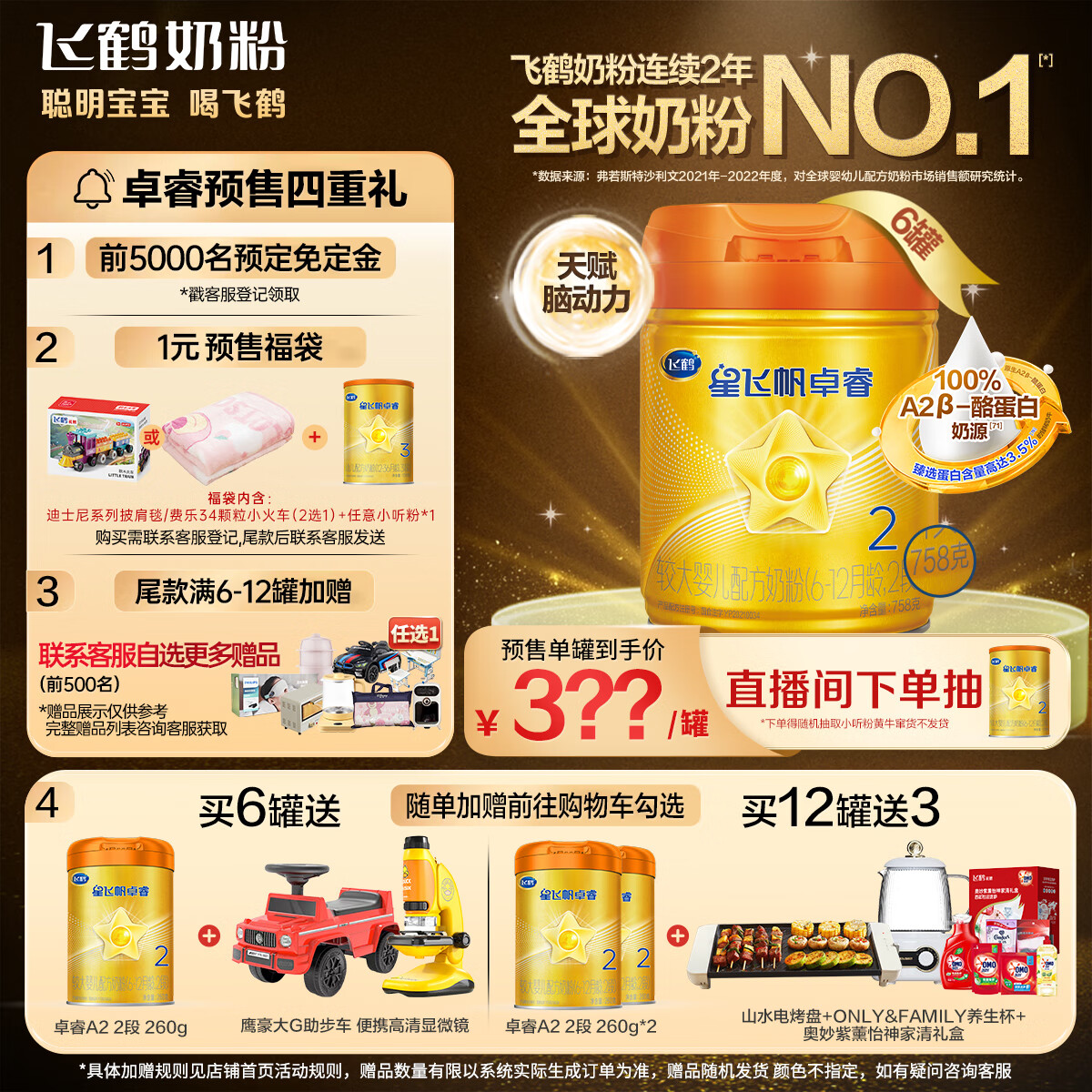 飞鹤星飞帆卓睿高配版A2β酪蛋白2段(6-12个月)幼儿配方奶粉758g *6价格:2072.30元!
