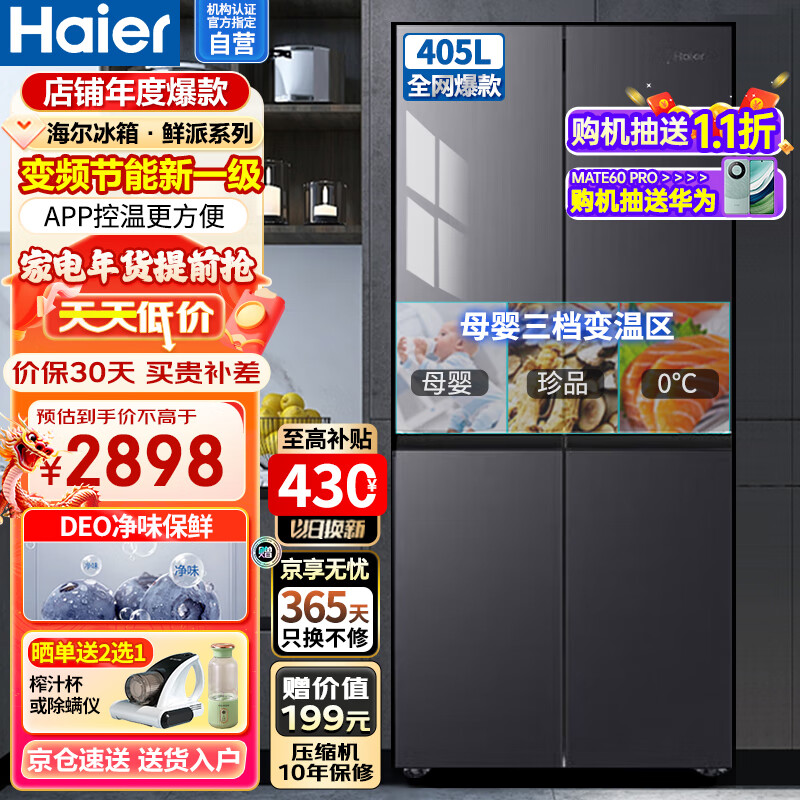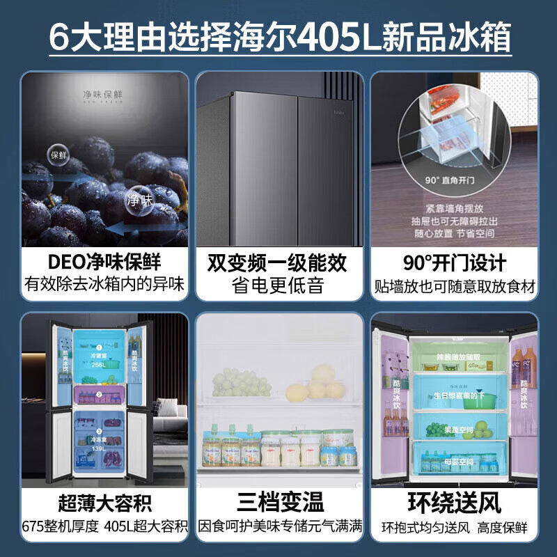 海尔(Haier)冰箱鲜派405升十字四开门风冷无霜超薄家用大容量净味APP控温双变频新一级节能BCD-405WLHTDEDS9U1价格:2898.00元!