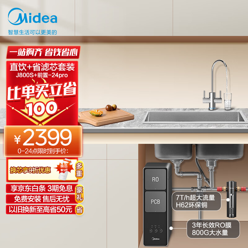 美的(Midea)省芯直饮净水器套装【麒麟J800S+前置过滤器-24pro】厨下式双出水龙头 RO反渗透家用一体净饮机价格:2399.00元!
