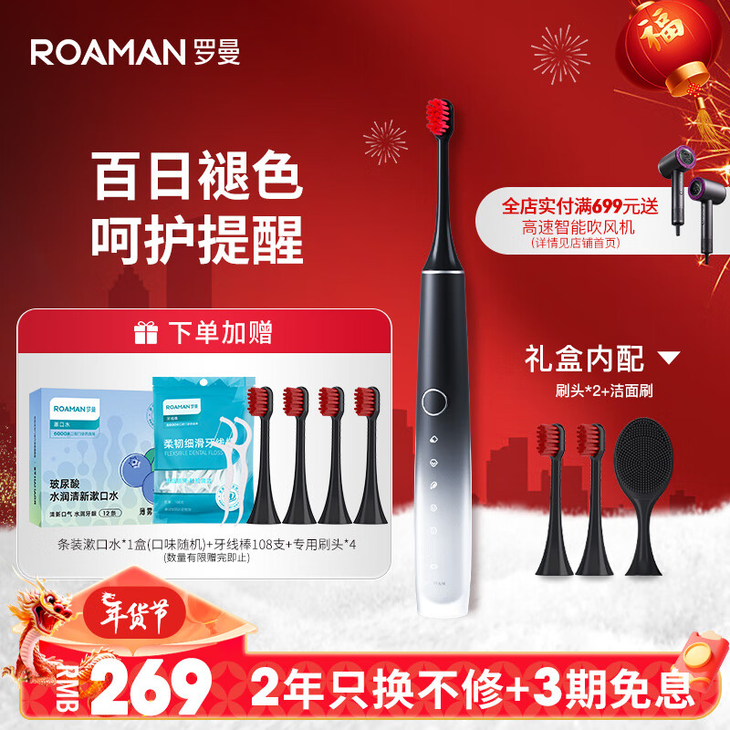 罗曼(ROAMAN)电动牙刷成人情侣套装男女智能声波电动牙刷软毛洁面 T40小心机墨雾黑 节日新年礼物价格:299.00元!