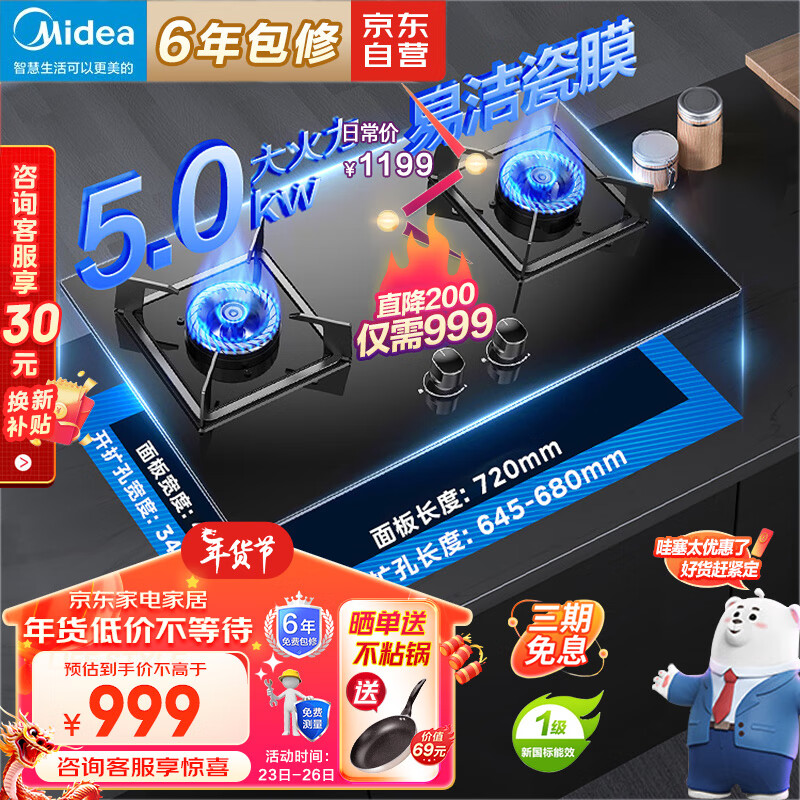 美的(Midea)燃气灶双灶家用5.0KW大火力黑晶宽面板台嵌两用双灶 天然气灶Q330价格:999.00元!