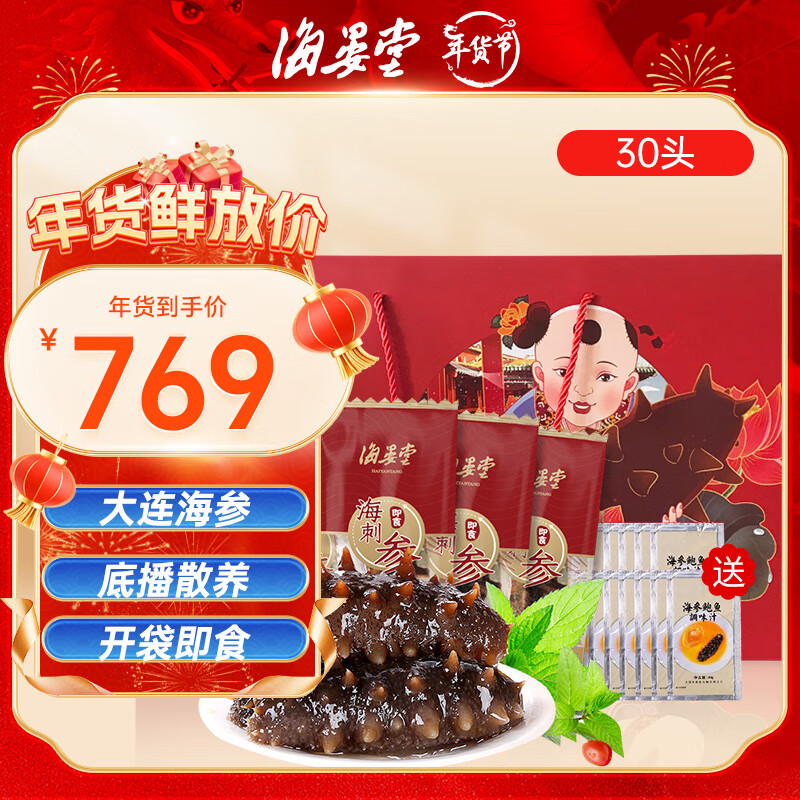 海晏堂 大连冷冻即食海参 1800g 30只 底播辽刺参 礼盒装价格:699.00元!