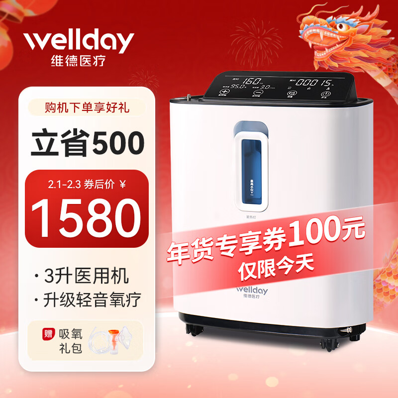 维德(WELLDAY)3L升医用制氧机家用大流量吸氧机氧气呼吸机老人孕妇呼吸氧疗雾化氧气机ZY-3HW价格:2890.00元!