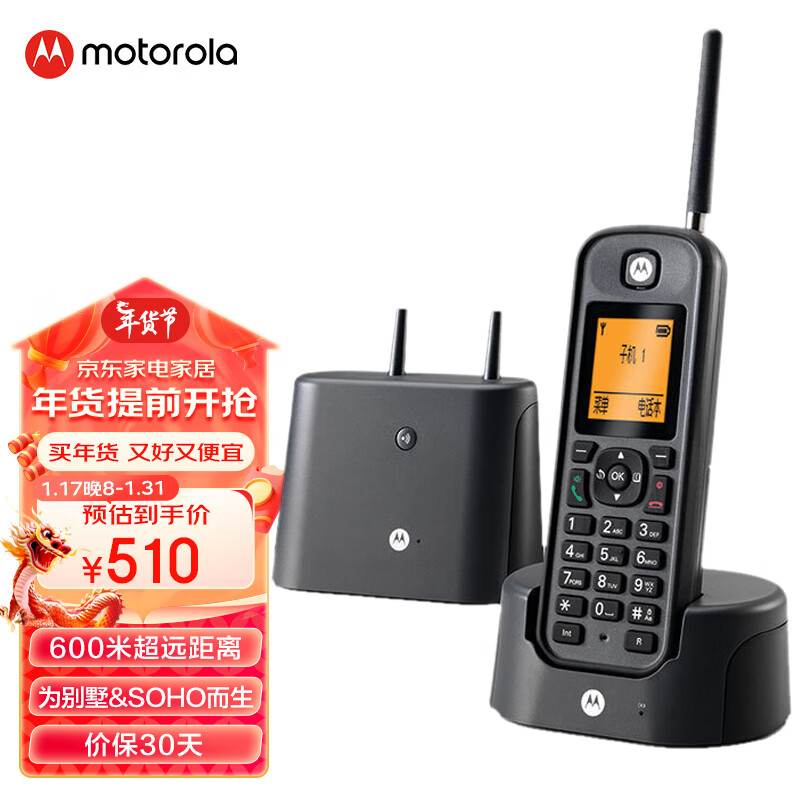 摩托罗拉(Motorola)远距离数字无绳电话机 无线座机 子母机单机 办公家用 中英文可扩展别墅定制O201C(黑色)价格:599.00元!