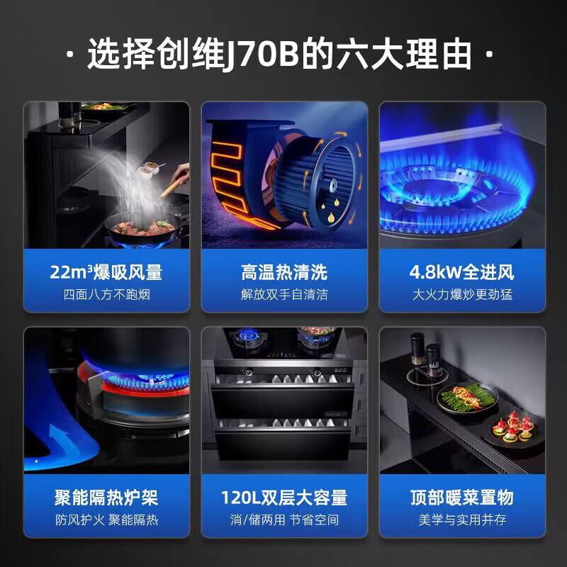 想知道创维JJZY-J70B,使用感受还不错的,我们一起来看看质量究竟怎样,集成灶热量集中,火力强劲,满足煎、炸、炒、炖、煲、煮,样样精通。用了它做起饭来方便多了!这家的客服很耐心,满意