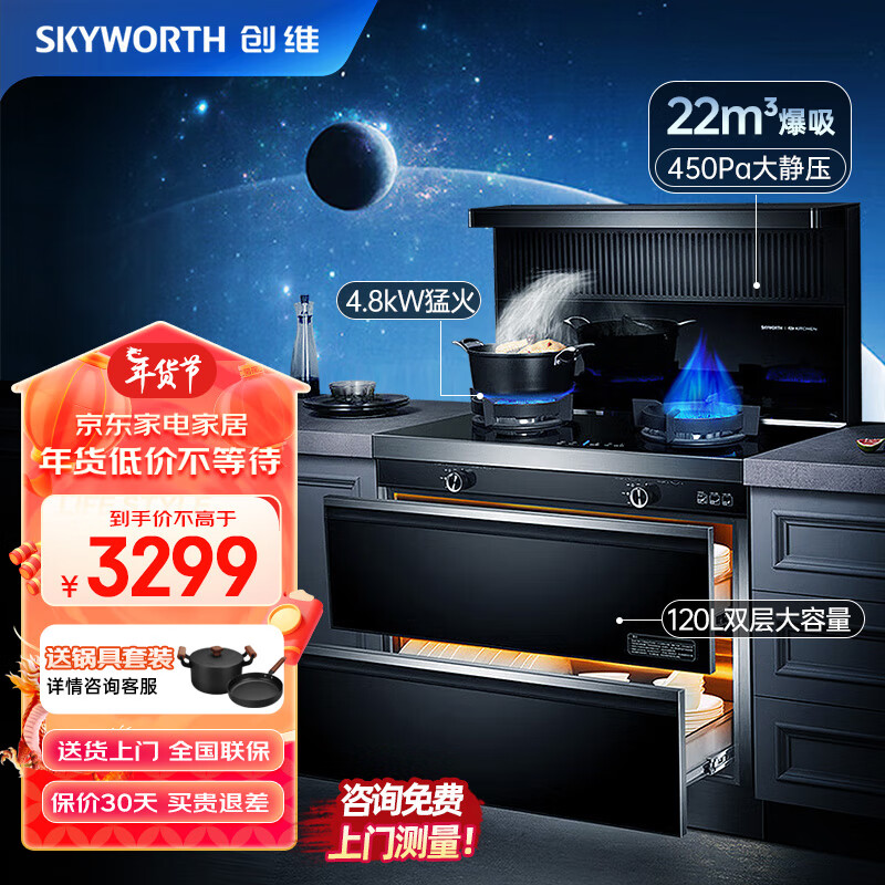 创维(Skyworth)集成灶一体灶 家用环保灶集成一体式 大吸力自动清洗 抽油烟机燃气灶烟灶消套装 JJZY-J70B价格:3599.00元!