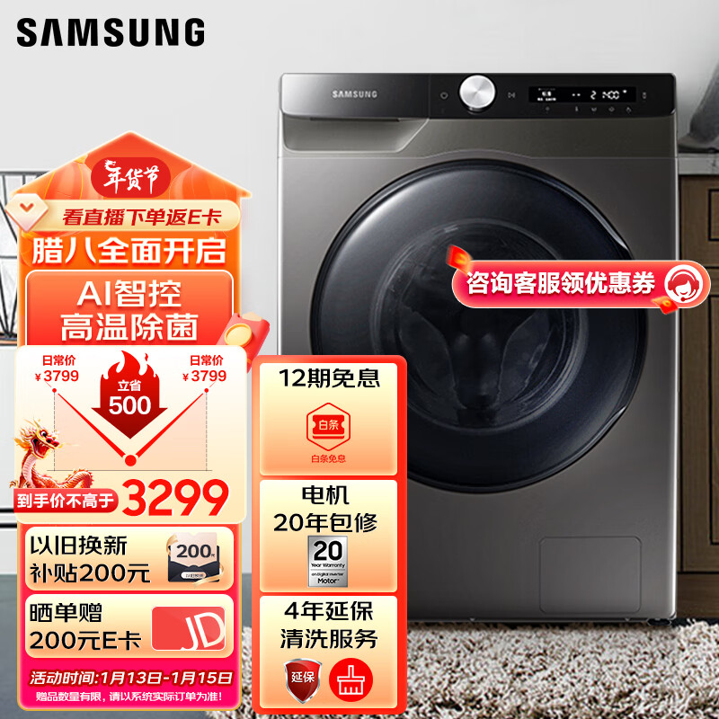 三星(SAMSUNG)10.5公斤全自动洗烘一体机大容量滚筒洗衣机蒸汽除菌泡泡净洗AI智控变频 以旧换新WD10T504DBX/SC价格:3299.00元!
