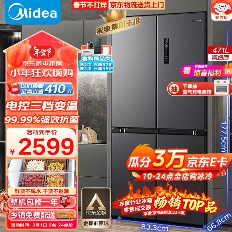 美的(Midea)慧鲜471升一级能效双变频十字双开四开多门风冷无霜家用大容量超薄电冰箱BCD-471WSPZM(E)价格:2599.00元!