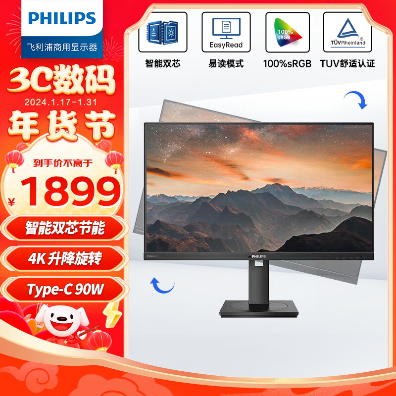 飞利浦(PHILIPS) 27英寸办公显示器 4K高清 低蓝光护眼 IPS Type-C90W 音响 旋转升降 智能双芯电脑显示器 279P1价格:1899.00元!