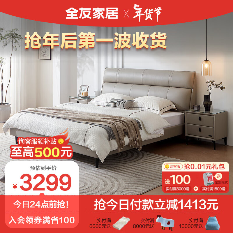 全友家居 现代简约头层牛皮双人床1.5米主卧分段靠包真皮软床116033价格:4712.86元!