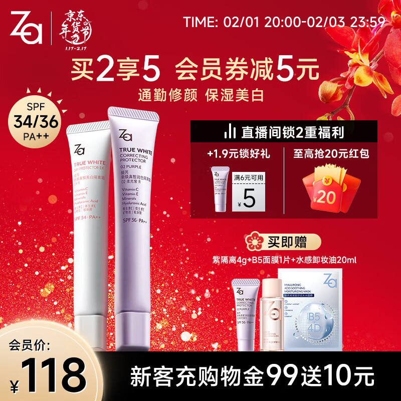 姬芮(ZA)双色隔离霜防晒遮瑕霜妆前乳三合一白色35g+紫色35g 送女友价格:123.00元!