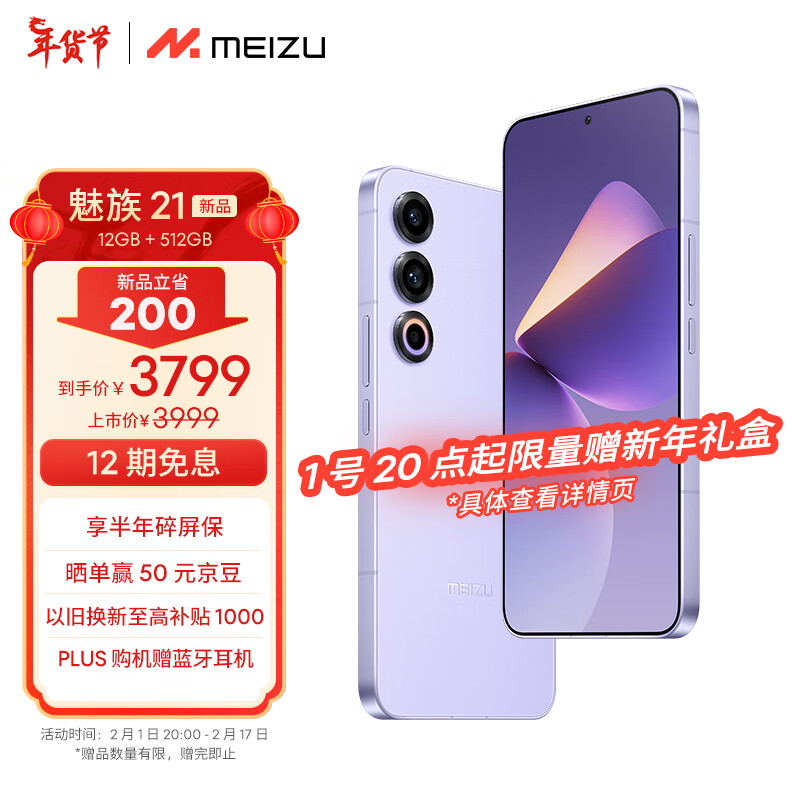 魅族(MEIZU)21 12GB+512GB 灵动紫 1.74mm极窄四等边直屏 骁龙8Gen3 2亿像素 80W超充 5G游戏学生拍照手机价格:3799.00元!