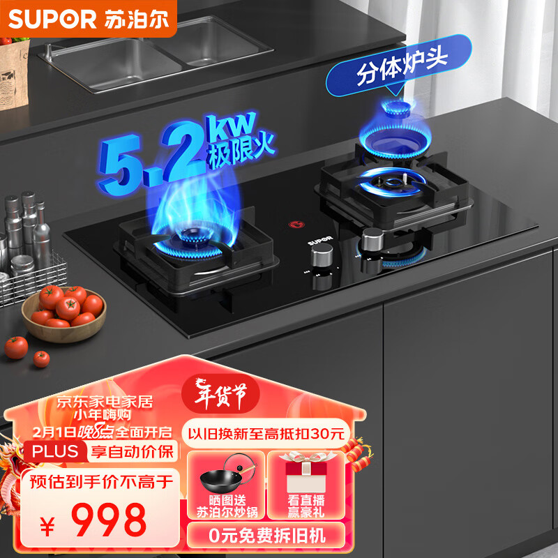苏泊尔(SUPOR) 燃气灶双灶家用 天然气双灶具5.2kW极限火 黑晶面板 全进风 聚能环燃气灶具 DB70天价格:998.00元!