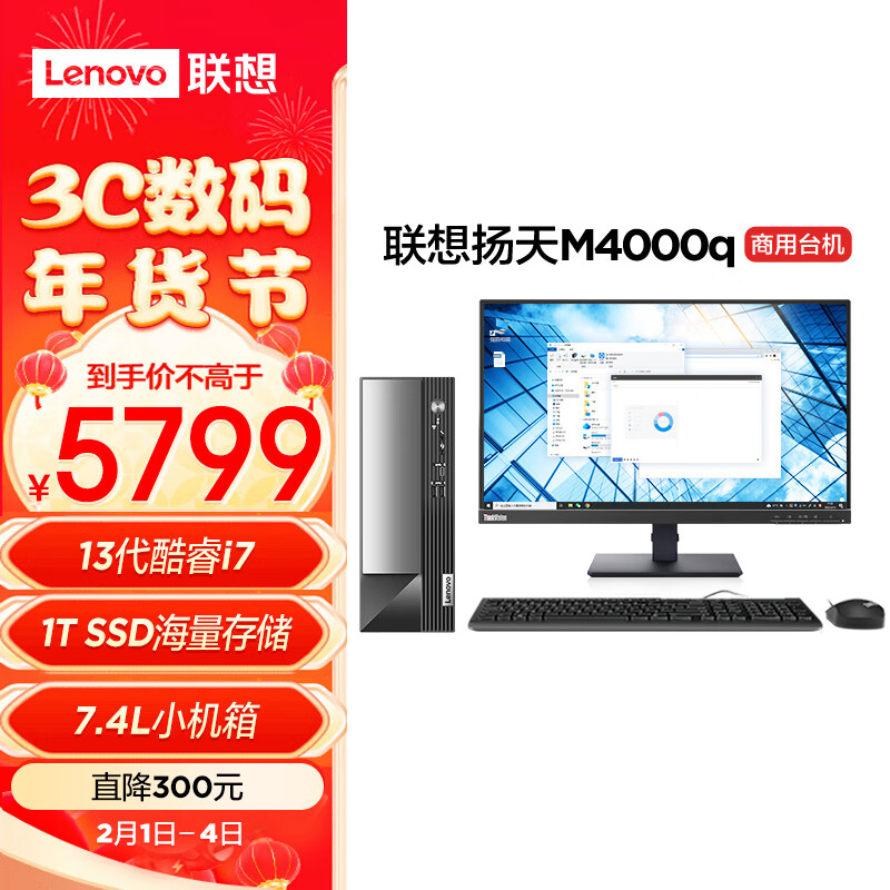 联想(Lenovo)扬天M4000q 商用办公台式电脑主机(酷睿13代i7-13700 16G 1TB SSD)23英寸价格:5799.00元!