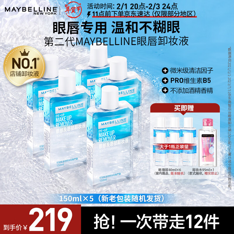 美宝莲眼部及唇部卸妆液套组990ml(150ml*5+40ml*6)全脸可卸新年礼物价格:219.00元!