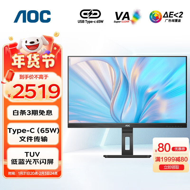 AOC31.5英寸4K type-c 65W反向充电 窄边框 旋转升降 低蓝光不闪屏 专业设计商务办公显示器U32P2C价格:2599.00元!