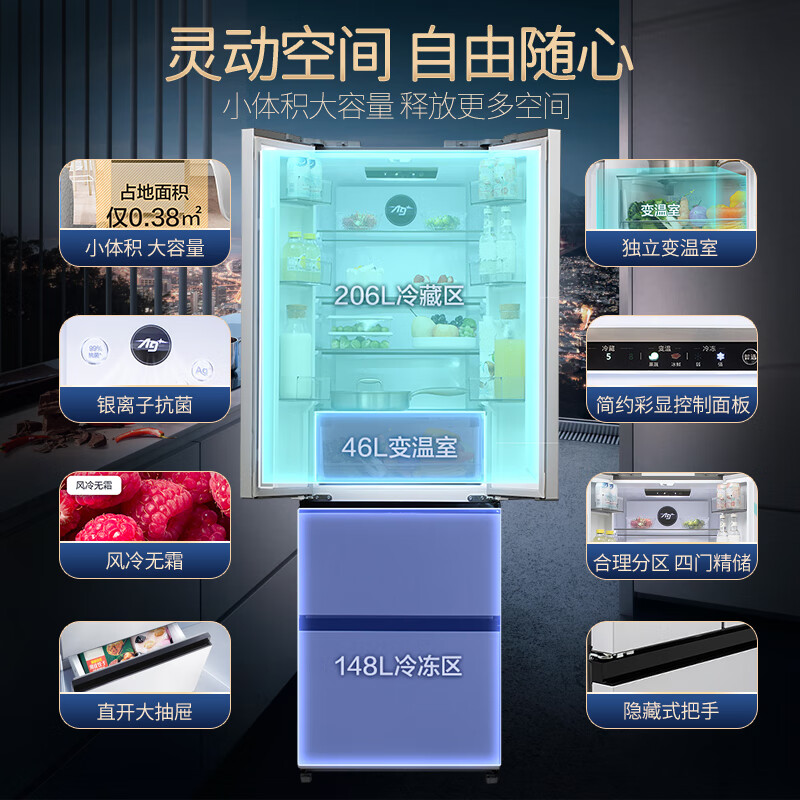 2、冰箱简单太赞了,尺寸像是量身定制,小户型也可以拥有四门的冰箱。几乎没有声音,很好。