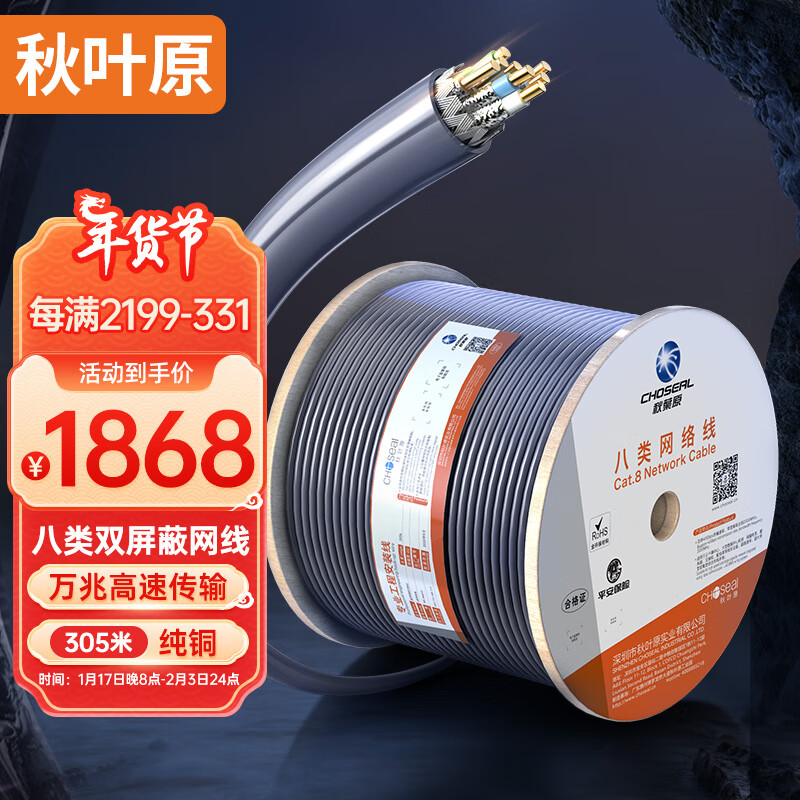 秋叶原(CHOSEAL)八类双屏蔽工程网线【电竞级0.64mm】Cat8 纯铜线芯40G万兆高速 灰色305米QS2680AT305价格:2199.00元!