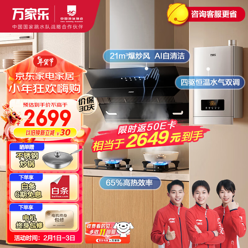 万家乐 抽油烟机侧吸自清洗21m3/min大吸力 5.0kW大火力燃气灶16升热水器三件套AJ4+KV061B+16LD5天然气价格:2899.00元!