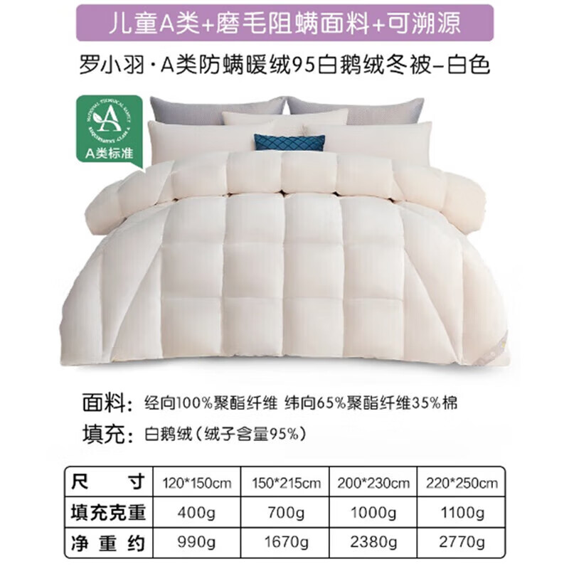 罗莱儿童 暖绒 母婴A类防螨95%白鹅绒羽绒被 冬被 4.7斤200*230cm白色价格:2399.00元!
