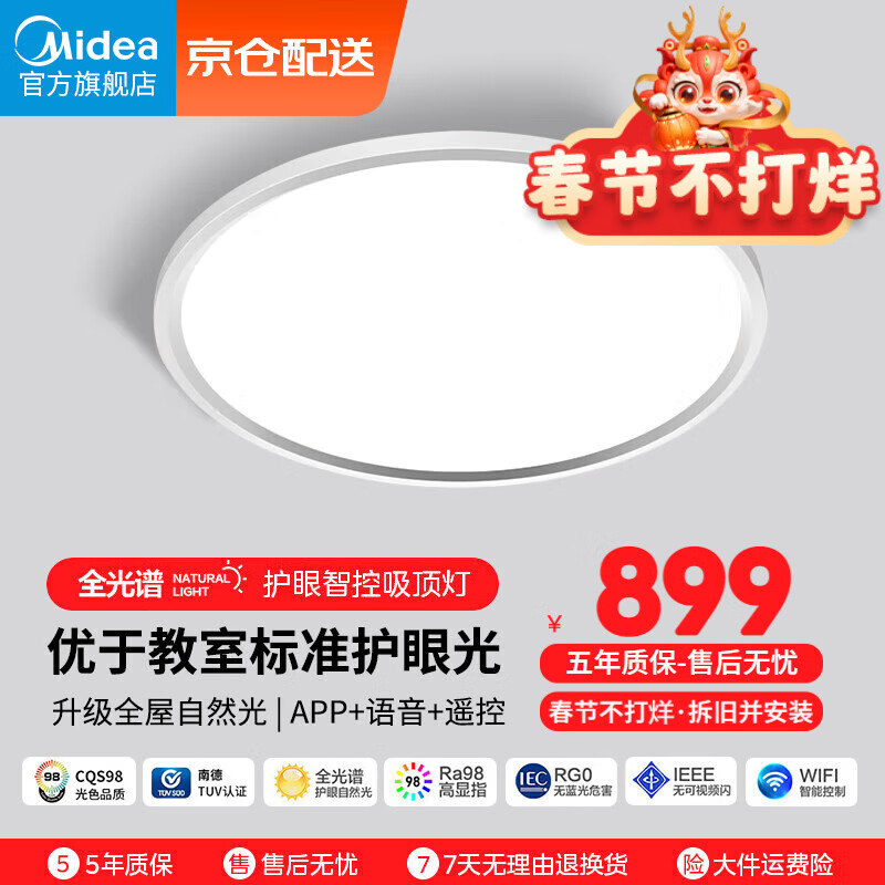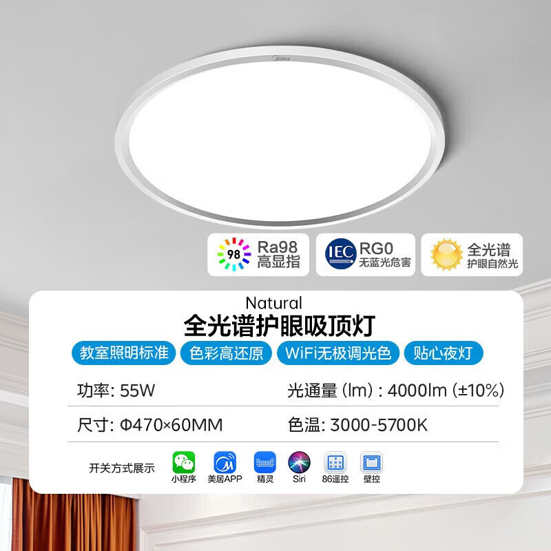 美的(Midea)LED护眼防蓝光客厅灯吸顶灯卧室儿童房灯具全光谱学习智控圆灯价格:899.00元!