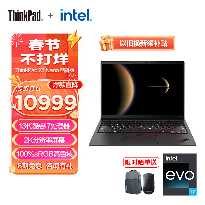 ThinkPad X1 Nano 联想 13代酷睿英特尔Evo平台 13英寸轻薄商务办公笔记本电脑 2023款可选 13代i7 16G 512G 2K 4G版0ECD价格:10999.00元!