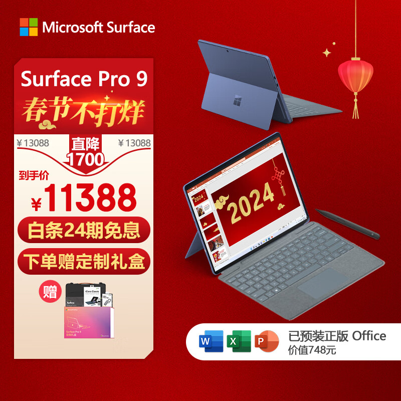 微软Surface Pro 9 宝石蓝+冰晶蓝带触控笔键盘盖i5 16G+256G 二合一平板电脑13英寸120Hz触控屏游戏本价格:11388.00元!
