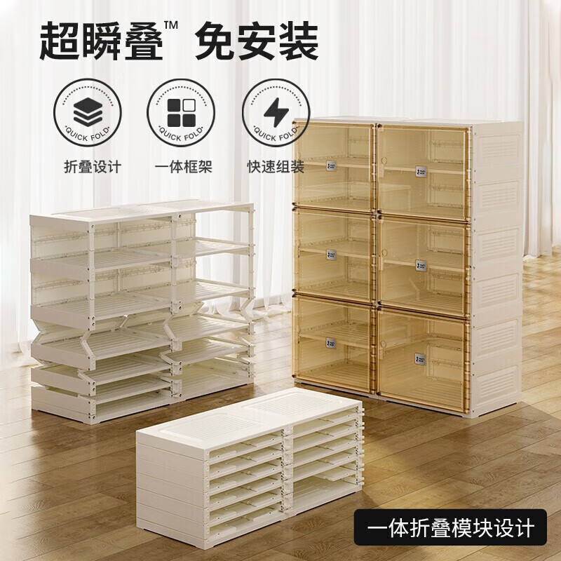 3、安装比较简单,无需工具,需要展开的挡板展开好,就成型了,磁吸式柜门安装也很简单,这种比单个堆叠的鞋盒好,整体感高了很多。