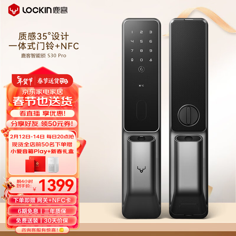 鹿客(lockin)S30Pro内置门铃全自动智能门锁指纹密码电子锁支持APP智能联动价格:1899.00元!