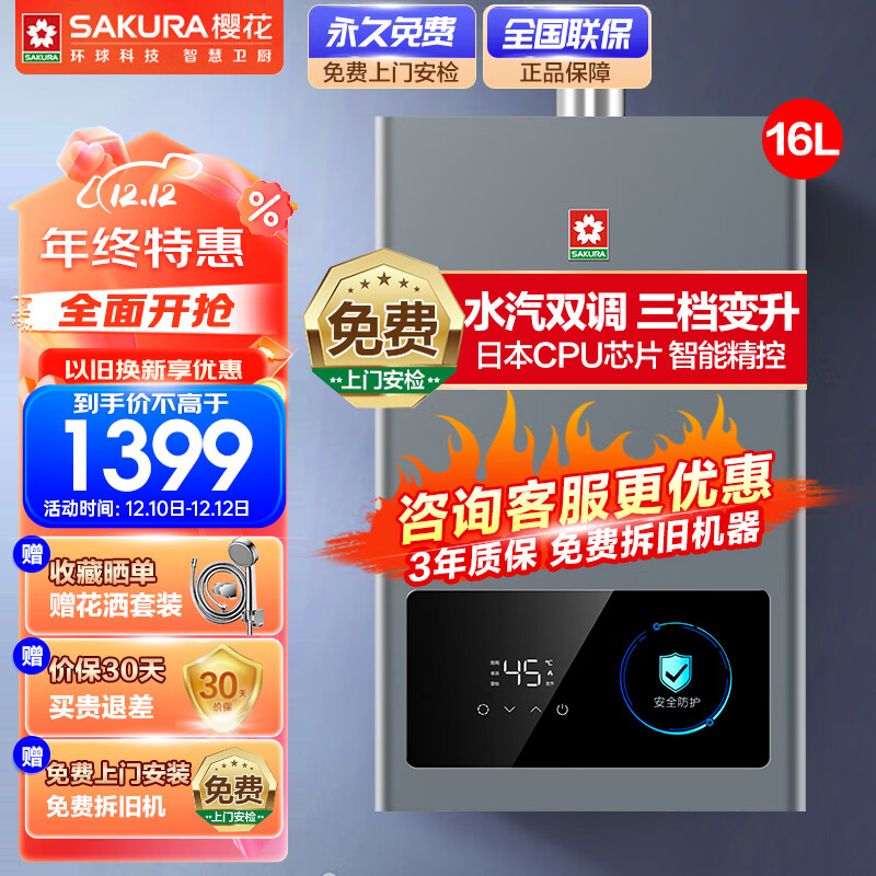 樱花(SAKURA)16升燃气热水器天然气家用水气双调日本CPU智能精控恒温低压启动三档变升多重安防JSQ30-JJP009价格:1599.00元!