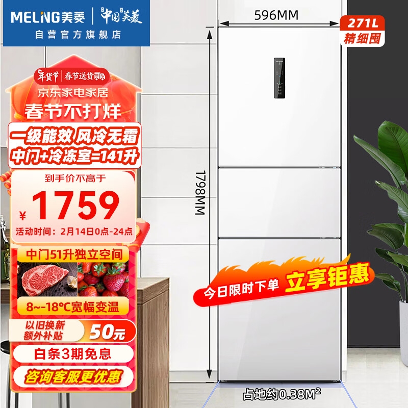 美菱(MeiLing)【离子净】271升三门家用冰箱变频一级风冷无霜低噪租房宿舍白色小型冰箱BCD-271WP3CX以旧换新价格:1718.00元!