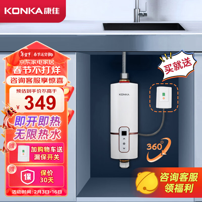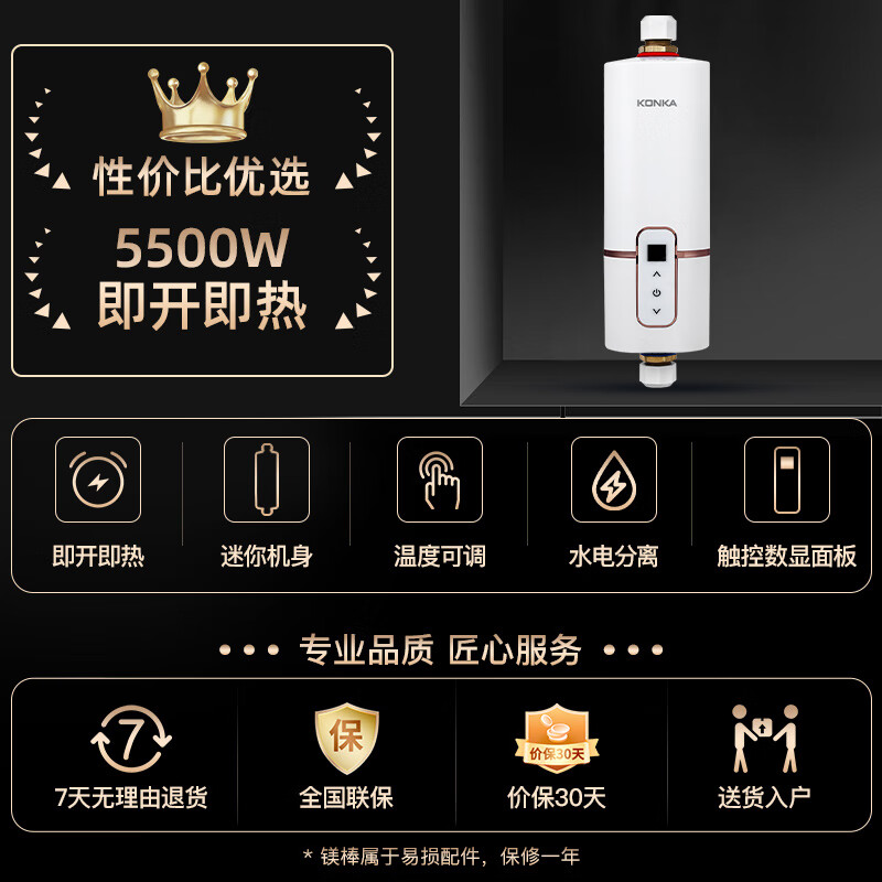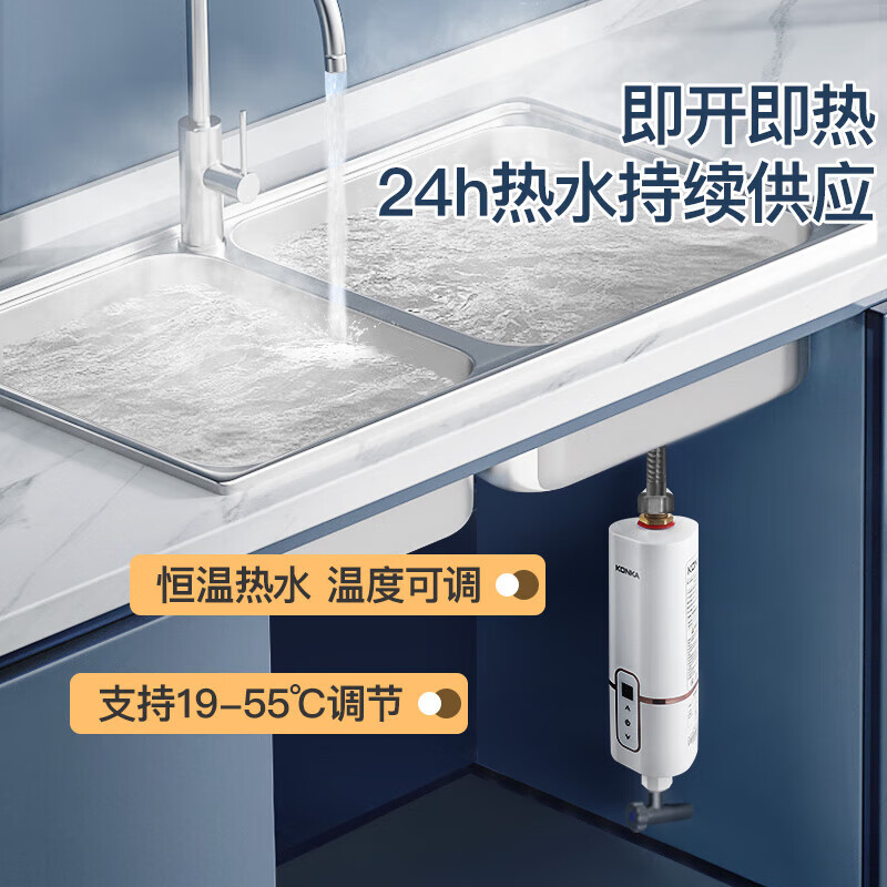 康佳(KONKA)电热水器 即热小厨宝 5500W即开即热不限水量免储水 家用小型厨房热水宝DSZF-JR05(自行安装)价格:349.00元!