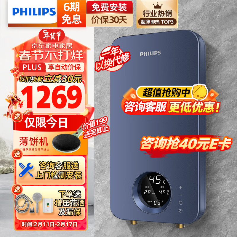 飞利浦(PHILIPS)即热式电热水器 电即热8500W速热无极变频智能恒温无胆免储水 淋浴洗澡水电分离AWH1028/93价格:1409.00元!